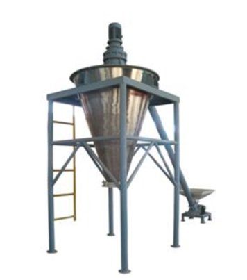 双螺旋锥形混合机(双螺旋混合机)的搅拌部件为两条不对称悬臂(转臂);不同长度,它们环绕锥形容器的中心轴轴线转动(公转)的同时,还借助转臂下方两根螺旋做自转运动; 该设备通过悬臂与螺旋的公、自转使物料反复提升实现混合目的。